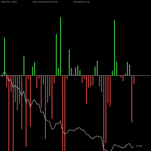 A force index chart is a relationship between price of stock and volume. Small bars are not of much significance, but a large bar tells that price either went up, or down, and volume was high too. If bars are red, it means prices fell compared to previous prices. The black line is the price line.