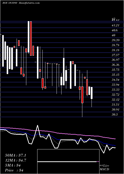 | Date | Closing | Open | Range | Volume | Thu 22 January 2026 | 33.95 (0%) | 32.00 | 32.00 - 33.95 | 0.0655 times | Wed 21 January 2026 | 33.95 (-0.15%) | 32.50 | 31.50 - 33.95 | 0.3912 times | Tue 20 January 2026 | 34.00 (3.03%) | 33.00 | 33.00 - 34.00 | 0.0266 times | Mon 19 January 2026 | 33.00 (-5.69%) | 34.89 | 32.84 - 36.00 | 0.973 times | Fri 16 January 2026 | 34.99 (9.34%) | 35.20 | 34.99 - 35.20 | 0.1536 times | Mon 12 January 2026 | 32.00 (-4.88%) | 34.00 | 30.30 - 35.58 | 6.4359 times | Fri 09 January 2026 | 33.64 (-6.56%) | 34.00 | 32.41 - 36.00 | 1.2392 times | Thu 08 January 2026 | 36.00 (-1.91%) | 36.00 | 36.00 - 36.00 | 0.1884 times | Wed 07 January 2026 | 36.70 (-0.19%) | 34.10 | 34.10 - 36.77 | 0.5018 times | Tue 06 January 2026 | 36.77 (-0.89%) | 37.10 | 36.77 - 37.10 | 0.0246 times | Mon 05 January 2026 | 37.10 (2.77%) | 33.75 | 33.75 - 37.10 | 0.0389 times |