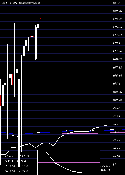 | Date | Closing | Open | Range | Volume | Thu 08 January 2026 | 118.86 (0.87%) | 119.00 | 118.50 - 119.00 | 0.0045 times | Tue 30 December 2025 | 117.84 (10.13%) | 107.00 | 87.00 - 136.00 | 1.1739 times | Tue 31 December 2024 | 107.00 (12.04%) | 94.01 | 81.63 - 113.50 | 0.7818 times | Fri 29 December 2023 | 95.50 (0%) | 85.50 | 71.15 - 107.00 | 2.0398 times | Fri 20 February 2026 | (0%) | - | 0 times |
