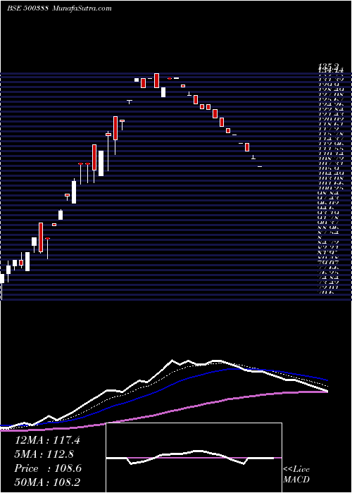 | Date | Closing | Open | Range | Volume | Wed 21 January 2026 | 108.60 (0%) | 108.60 | 108.60 - 108.60 | 0.3641 times | Tue 20 January 2026 | 108.60 (-1.99%) | 108.60 | 108.60 - 108.60 | 0.0048 times | Mon 19 January 2026 | 110.80 (-1.99%) | 110.80 | 110.80 - 111.90 | 0.5956 times | Fri 16 January 2026 | 113.05 (-1.99%) | 115.35 | 113.05 - 115.35 | 2.3511 times | Wed 14 January 2026 | 115.35 (-2%) | 115.35 | 115.35 - 115.35 | 0.082 times | Tue 13 January 2026 | 117.70 (-0.47%) | 117.70 | 117.70 - 117.70 | 0.0024 times | Mon 12 January 2026 | 118.25 (-1.5%) | 119.45 | 118.25 - 119.45 | 0.0096 times | Fri 09 January 2026 | 120.05 (-2%) | 122.50 | 120.05 - 122.50 | 0.2194 times | Thu 08 January 2026 | 122.50 (-2%) | 125.00 | 122.50 - 125.00 | 0.9838 times | Wed 07 January 2026 | 125.00 (-0.08%) | 126.35 | 125.00 - 126.35 | 5.387 times | Tue 06 January 2026 | 125.10 (-1.07%) | 126.35 | 125.10 - 126.35 | 1.3431 times |