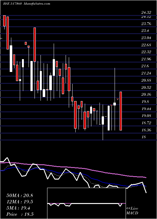 | Date | Closing | Open | Range | Volume | Tue 20 January 2026 | 18.50 (-7.91%) | 20.45 | 18.50 - 20.45 | 1.3262 times | Mon 19 January 2026 | 20.09 (0.95%) | 20.10 | 20.03 - 20.10 | 0.5312 times | Fri 16 January 2026 | 19.90 (0.71%) | 19.76 | 18.50 - 21.65 | 3.1151 times | Wed 14 January 2026 | 19.76 (0.15%) | 19.78 | 18.50 - 19.78 | 1.0924 times | Tue 13 January 2026 | 19.73 (2.76%) | 18.50 | 18.50 - 19.75 | 0.01 times | Mon 12 January 2026 | 19.20 (0%) | 19.20 | 19.20 - 19.20 | 0.1169 times | Fri 09 January 2026 | 19.20 (2.13%) | 18.80 | 18.00 - 19.80 | 2.8345 times | Thu 08 January 2026 | 18.80 (-3.49%) | 18.80 | 18.80 - 19.90 | 0.5144 times | Wed 07 January 2026 | 19.48 (0%) | 19.48 | 18.80 - 19.48 | 0.0568 times | Tue 06 January 2026 | 19.48 (-1.07%) | 19.60 | 19.00 - 19.60 | 0.4025 times | Mon 05 January 2026 | 19.69 (2.71%) | 19.36 | 18.70 - 19.75 | 0.8034 times |