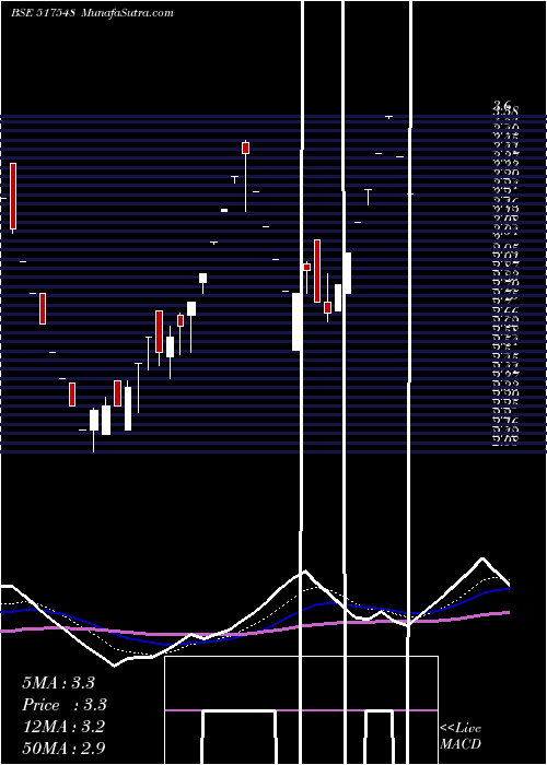 | Date | Closing | Open | Range | Volume | Fri 06 September 2024 | 3.64 (4.9%) | 3.64 | 3.64 - 3.64 | 1.6571 times | Thu 05 September 2024 | 3.47 (4.83%) | 3.47 | 3.47 - 3.47 | 0.2445 times | Wed 04 September 2024 | 3.31 (4.75%) | 3.31 | 3.31 - 3.31 | 0.0016 times | Tue 03 September 2024 | 3.16 (4.98%) | 3.16 | 3.10 - 3.16 | 0.3885 times | Mon 02 September 2024 | 3.01 (-3.83%) | 3.13 | 3.00 - 3.28 | 1.2135 times | Mon 26 August 2024 | 3.13 (-2.49%) | 3.05 | 3.05 - 3.37 | 0.6969 times | Mon 19 August 2024 | 3.21 (-0.93%) | 3.40 | 3.08 - 3.40 | 2.2967 times | Mon 12 August 2024 | 3.24 (4.85%) | 2.94 | 2.94 - 3.24 | 2.5871 times | Mon 05 August 2024 | 3.09 (-4.92%) | 3.09 | 3.09 - 3.09 | 0.5618 times | Mon 29 July 2024 | 3.25 (-4.97%) | 3.25 | 3.25 - 3.25 | 0.3524 times | Mon 22 July 2024 | 3.42 (-5%) | 3.42 | 3.42 - 3.42 | 1.9563 times |