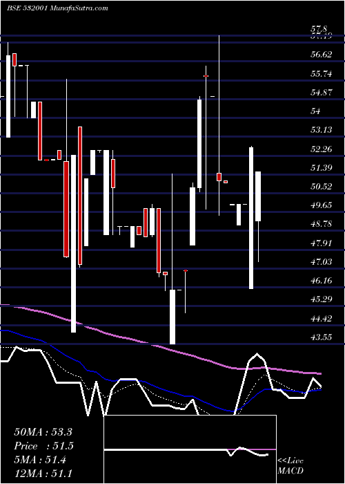 | Date | Closing | Open | Range | Volume | Wed 21 January 2026 | 51.50 (-2.15%) | 49.25 | 47.37 - 51.50 | 4.3567 times | Tue 20 January 2026 | 52.63 (5.26%) | 46.10 | 46.10 - 52.70 | 0.8804 times | Mon 19 January 2026 | 50.00 (0%) | 50.00 | 50.00 - 50.00 | 0.0085 times | Fri 16 January 2026 | 50.00 (0%) | 49.05 | 49.05 - 50.00 | 0.0875 times | Wed 14 January 2026 | 50.00 (-1.96%) | 49.98 | 49.98 - 50.00 | 0.4853 times | Tue 13 January 2026 | 51.00 (-0.22%) | 51.11 | 51.00 - 51.11 | 1.4814 times | Mon 12 January 2026 | 51.11 (-7.07%) | 51.45 | 49.50 - 57.80 | 1.0356 times | Fri 09 January 2026 | 55.00 (-1.66%) | 55.00 | 55.00 - 55.00 | 0.0564 times | Thu 08 January 2026 | 55.93 (1.97%) | 55.95 | 49.78 - 56.40 | 1.3685 times | Tue 06 January 2026 | 54.85 (8.04%) | 50.77 | 50.60 - 54.99 | 0.2398 times | Fri 02 January 2026 | 50.77 (8.16%) | 48.11 | 48.11 - 51.00 | 5.2257 times |