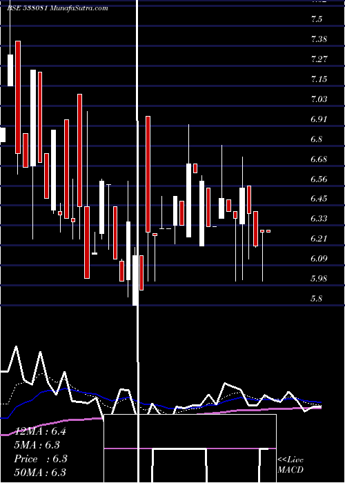 | Date | Closing | Open | Range | Volume | Fri 19 December 2025 | 6.29 (0%) | 6.30 | 6.29 - 6.30 | 0.0216 times | Thu 18 December 2025 | 6.29 (1.29%) | 6.30 | 6.00 - 6.30 | 0.1981 times | Wed 17 December 2025 | 6.21 (-2.97%) | 6.41 | 6.20 - 6.41 | 1.2027 times | Tue 16 December 2025 | 6.40 (-2.29%) | 6.56 | 6.13 - 6.56 | 0.97 times | Mon 15 December 2025 | 6.55 (2.83%) | 6.34 | 6.01 - 6.73 | 1.8574 times | Fri 12 December 2025 | 6.37 (-0.62%) | 6.41 | 6.00 - 6.41 | 0.8442 times | Thu 11 December 2025 | 6.41 (-1.23%) | 6.48 | 6.41 - 6.48 | 1.9374 times | Wed 10 December 2025 | 6.49 (2.69%) | 6.37 | 6.37 - 6.80 | 1.5827 times | Tue 09 December 2025 | 6.32 (0%) | 6.32 | 6.32 - 6.32 | 0.94 times | Mon 08 December 2025 | 6.32 (-4.1%) | 6.55 | 6.32 - 6.55 | 0.4459 times | Fri 05 December 2025 | 6.59 (-0.75%) | 6.21 | 6.21 - 6.62 | 0.4359 times |