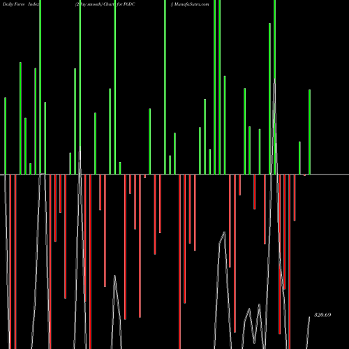 A force index chart is a relationship between price of stock and volume. Small bars are not of much significance, but a large bar tells that price either went up, or down, and volume was high too. If bars are red, it means prices fell compared to previous prices. The black line is the price line.