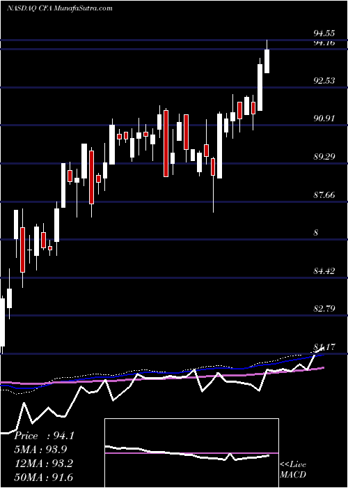 | Date | Closing | Open | Range | Volume | Fri 16 January 2026 | 94.14 (-0.16%) | 94.21 | 94.05 - 94.33 | 0.6865 times | Thu 15 January 2026 | 94.29 (0.54%) | 94.09 | 94.09 - 94.55 | 1.3387 times | Wed 14 January 2026 | 93.78 (0.32%) | 93.60 | 93.43 - 93.78 | 0.8238 times | Tue 13 January 2026 | 93.48 (-0.06%) | 93.81 | 93.32 - 93.83 | 0.7895 times | Mon 12 January 2026 | 93.54 (0.02%) | 93.16 | 93.16 - 93.64 | 2.4714 times | Fri 09 January 2026 | 93.52 (0.62%) | 93.34 | 93.26 - 93.77 | 0.7666 times | Thu 08 January 2026 | 92.94 (0.61%) | 92.69 | 92.69 - 93.16 | 0.6064 times | Wed 07 January 2026 | 92.38 (-1%) | 93.31 | 92.31 - 93.31 | 0.8352 times | Tue 06 January 2026 | 93.31 (1.05%) | 92.49 | 92.45 - 93.41 | 1.0755 times | Mon 05 January 2026 | 92.34 (1.02%) | 91.54 | 91.54 - 92.48 | 0.6064 times | Fri 02 January 2026 | 91.41 (0.44%) | 91.21 | 90.71 - 91.64 | 0.6979 times |