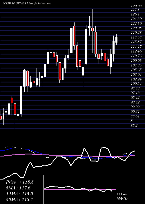 Volume Weighted Averaged Price (VWAP) for short term is 114.91 and SenecaFoods SENEA stock is trading above this level. This is a good sign for the stock and it could move higher. VWAP is rising upwards.