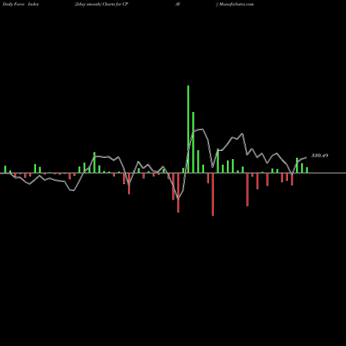 A force index chart is a relationship between price of stock and volume. Small bars are not of much significance, but a large bar tells that price either went up, or down, and volume was high too. If bars are red, it means prices fell compared to previous prices. The black line is the price line.